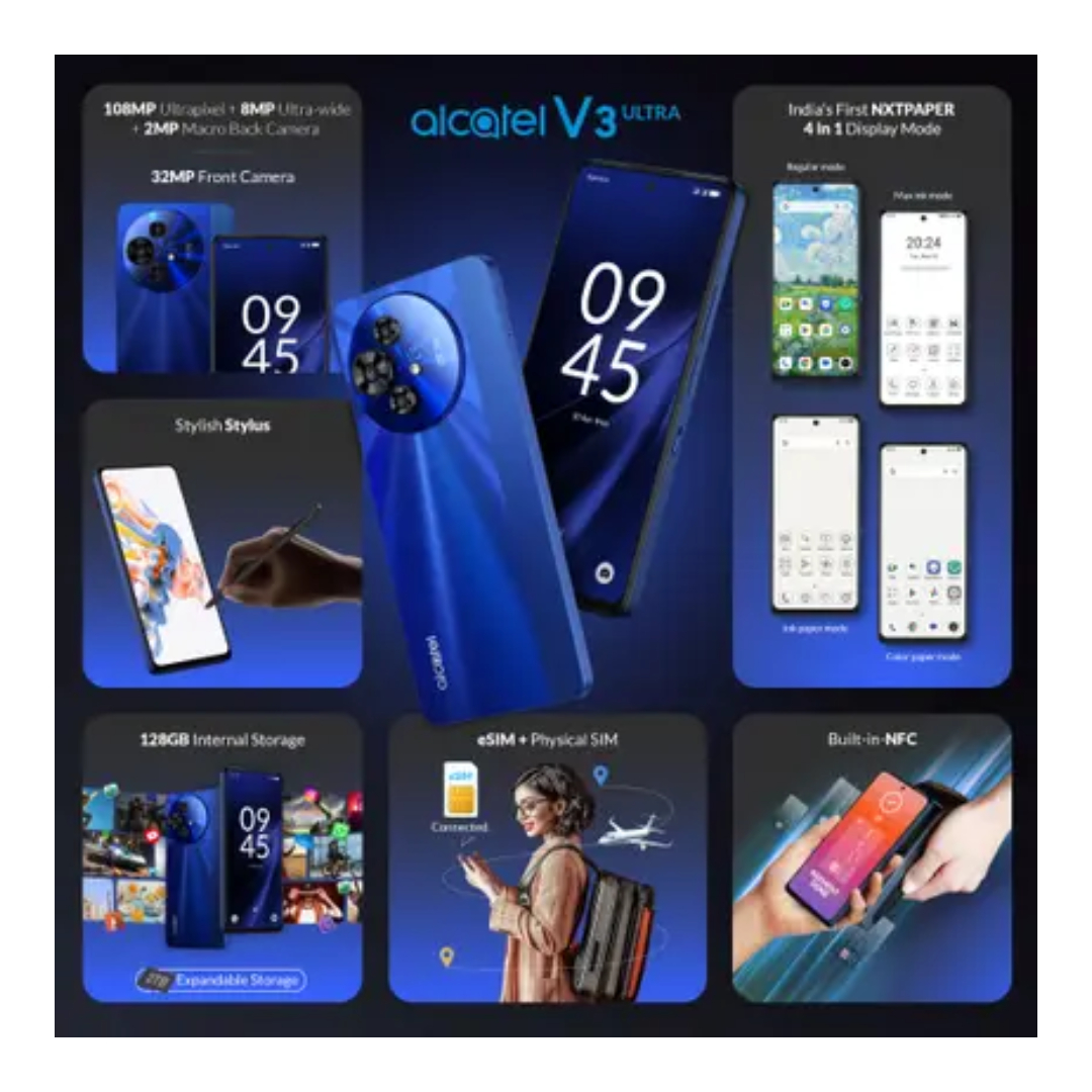 The Alcatel V3 Ultra offers strong performance with its Dimensity 6300 processor, 6 GB RAM, and 128 GB storage for smooth multitasking. Its 6.78-inch Full HD+ display with a 120 Hz refresh rate delivers sharp and fluid visuals. The 108 MP triple rear camera setup and 32 MP front camera provide high-quality photos in any lighting. A 5010 mAh battery with 33W fast charging ensures reliable all-day power. With Dual SIM 5G, NFC, and support for up to 2 TB expandable storage on Android v14, it delivers a powerful, feature-packed experience.