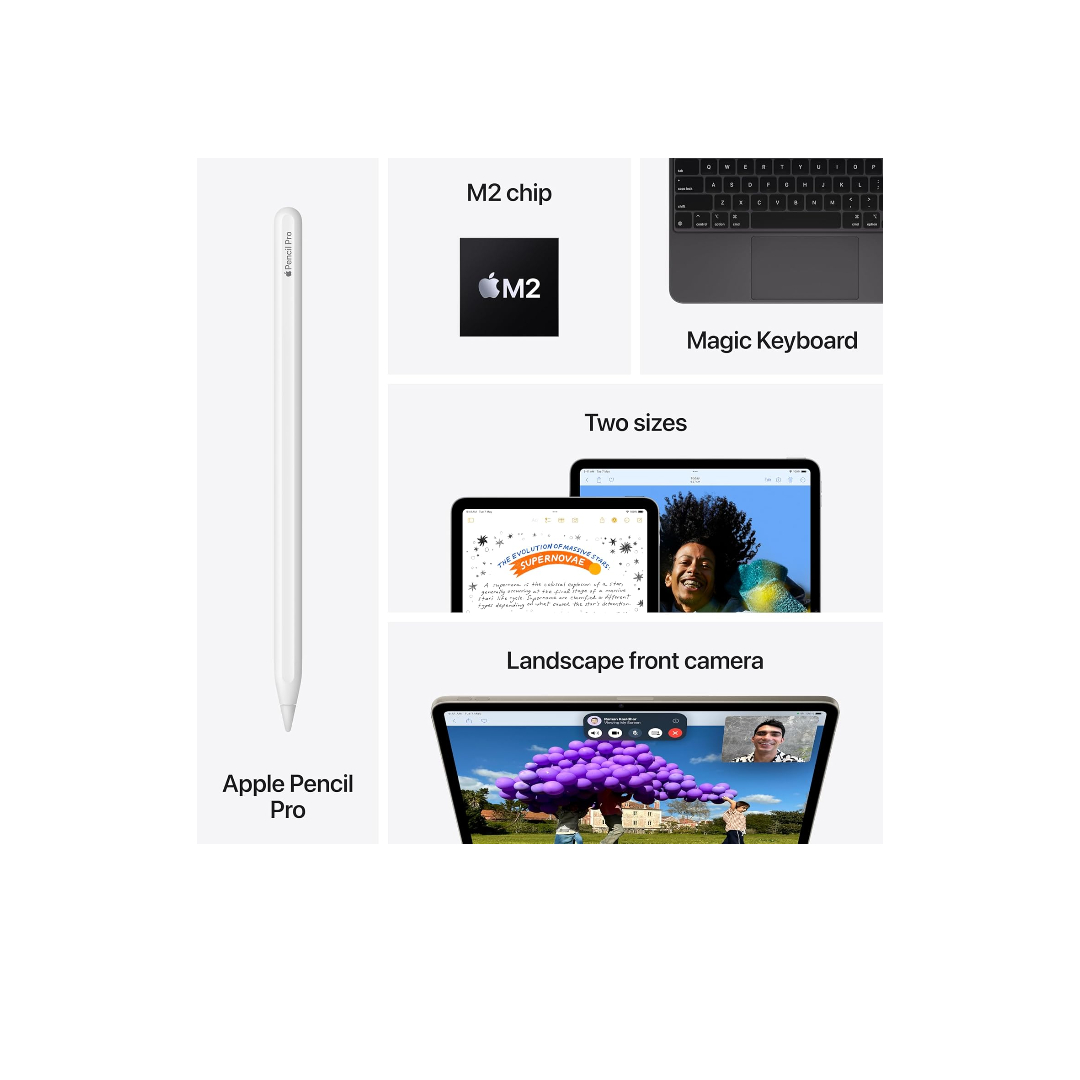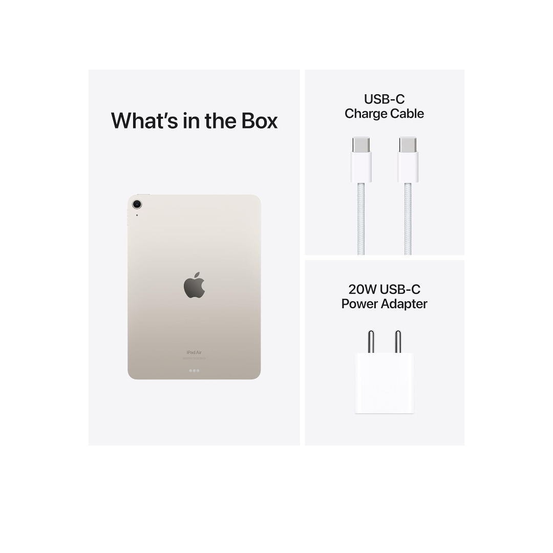 Apple iPad Air 2024 11 inch Tablet features an M2 Octa Core processor with 8GB RAM and 128GB storage for smooth performance. It supports 5G, VoLTE and Wi-Fi, offering fast connectivity for work and entertainment. The 11-inch display with 1640×2360 resolution delivers clear and vibrant visuals. Its 7819 mAh battery supports fast charging for long usage. A 12MP rear and 12MP front camera complete this powerful iPad running on iPadOS v17.4.