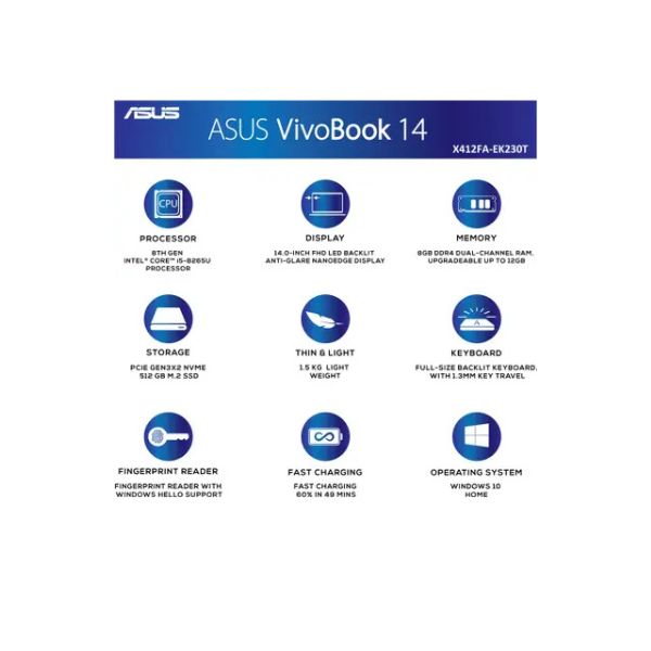 Asus VivoBook 14 X412FA is a sleek and capable laptop powered by an 8th Gen Intel Core i5-8265U quad-core processor with 8 GB DDR4 RAM and a fast 512 GB SSD for smooth performance and quick boot-ups. It features a 14-inch Full HD 1920 × 1080 display for crisp and vibrant visuals. The Intel UHD 620 integrated graphics deliver reliable performance for everyday tasks and media. Running Windows 10 Home, it offers a responsive and user-friendly experience. This laptop also includes a 1 year warranty for added peace of mind.