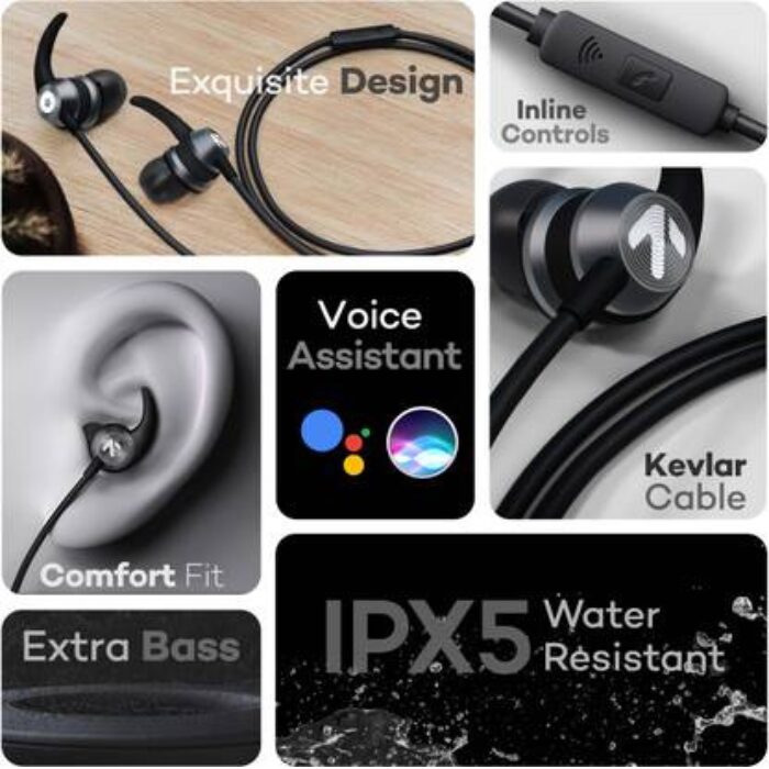 In-ear wired earphones with a built-in microphone and inline remote, delivering deep bass and clear sound for everyday listening. Designed to be sweat-proof for active use, they offer comfort, durability, and come with a 1-year warranty for reliable performance.