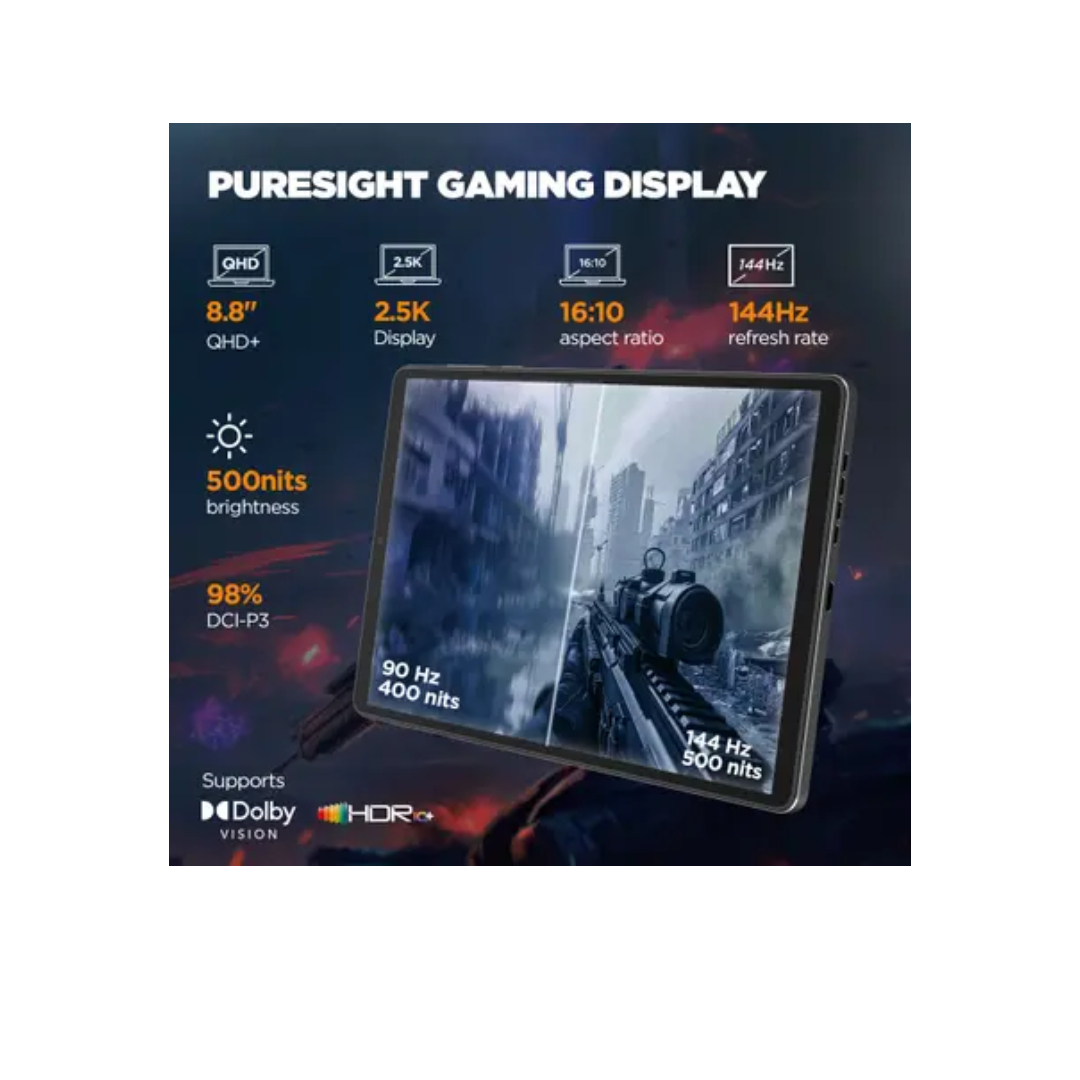 It features an immersive 8.8-inch display with 1600×2560 resolution and a smooth 144Hz refresh rate for gaming and entertainment.The 6550mAh battery with 45W fast charging ensures reliable performance with quick recharging.Capture detailed shots with the 13MP+2MP dual rear cameras and enjoy clear video calls with the 8MP front camera.