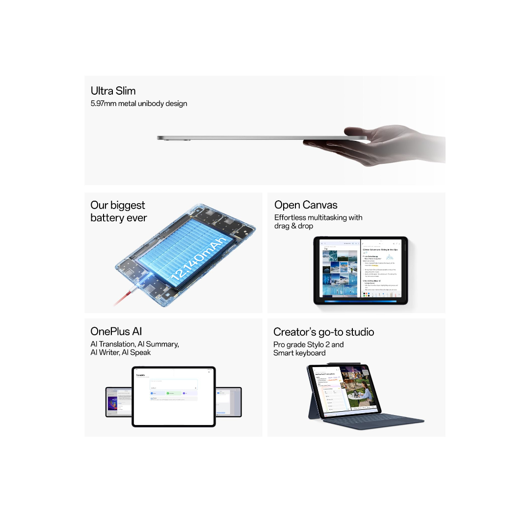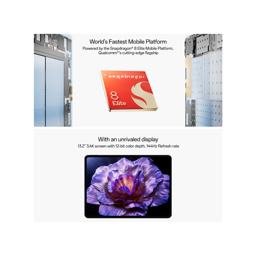The OnePlus Pad 3 is a high-performance Wi-Fi only tablet powered by the Snapdragon 8 Elite octa-core 4.32GHz processor with 12GB RAM and 256GB internal storage.It features a large 13.2-inch display with 2400×3392 resolution and a smooth 144Hz refresh rate for immersive viewing.The massive 12140mAh battery supports ultra-fast 80W charging for extended usage with minimal downtime.Capture sharp images and video calls with the 13MP rear camera and 8MP front camera.Running on Android 15, the OnePlus Pad 3 is designed for premium productivity, entertainment, and multitasking.