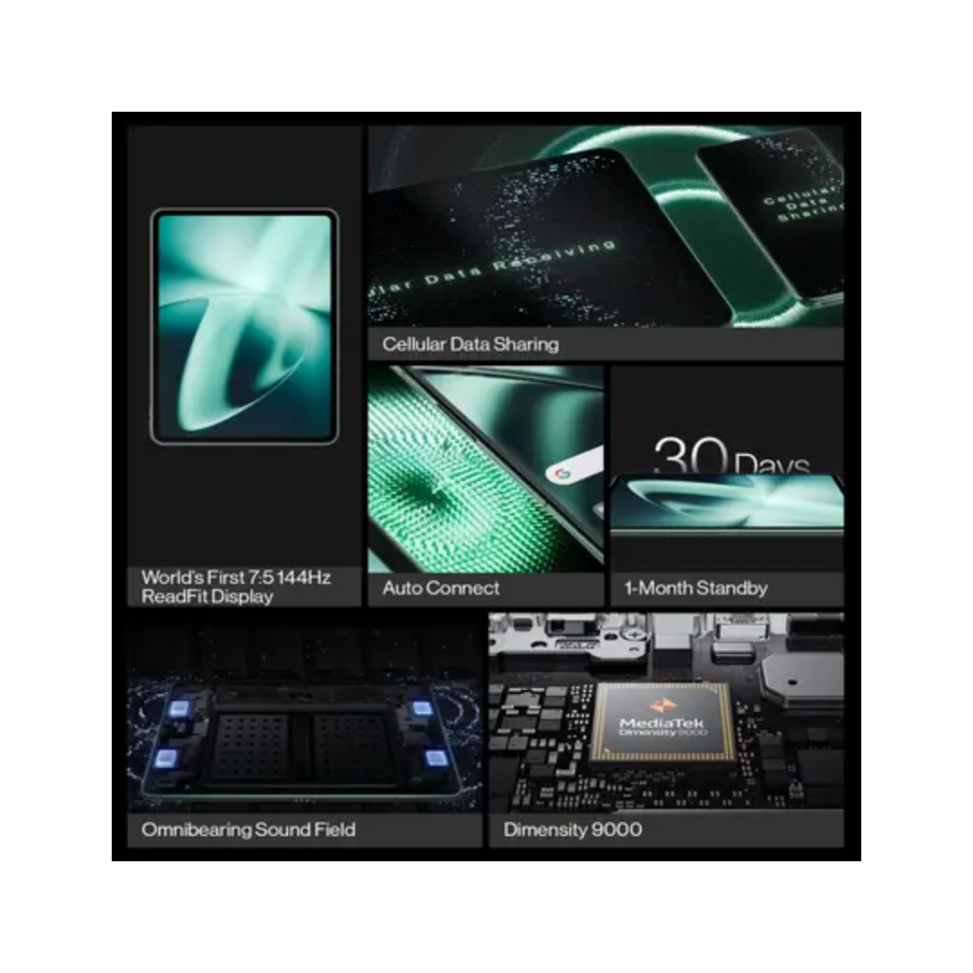The OnePlus Pad tablet delivers flagship-level performance thanks to its Dimensity 9000 octa-core processor running at 3.05 GHz and 8 GB RAM, making it great for heavy multitasking, creative work, and gaming. Its large 11.61-inch display with 2000 × 2800 resolution and a 144 Hz refresh rate offers ultra-smooth visuals — ideal for media, design, or productivity. The tablet has a 13 MP rear camera and an 8 MP front camera for high-quality photos and video calls. With 128 GB built-in storage, you have plenty of space for files, apps, and media. A 9510 mAh battery combined with 67 W fast charging ensures long usage sessions and quick top-ups.