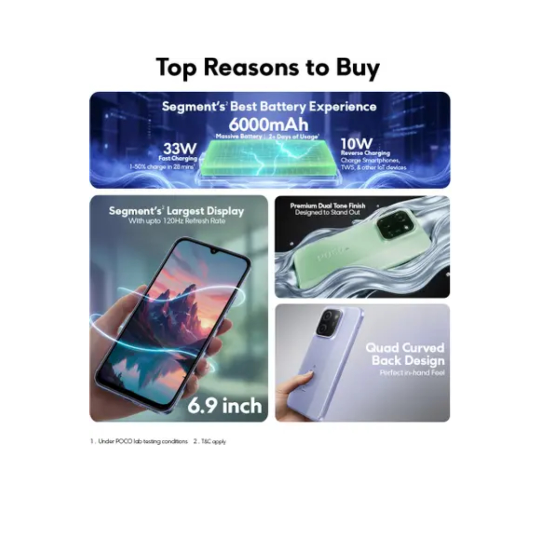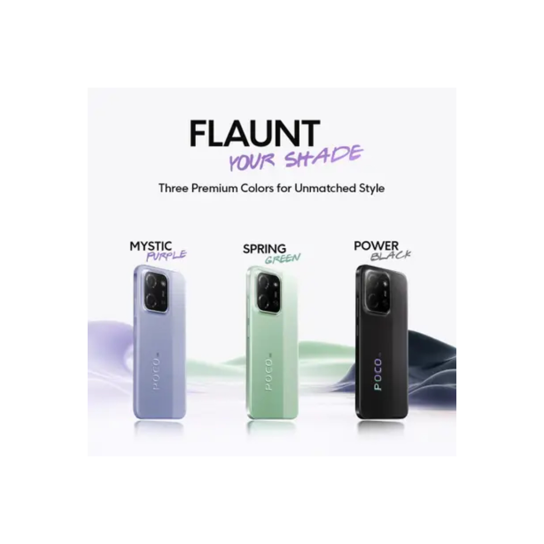 The POCO C85 5G is a versatile dual SIM smartphone offering fast connectivity with 3G, 4G, 5G, VoLTE, Wi-Fi, and NFC support. It is powered by the Dimensity 6300 octa-core processor clocked at 2.4 GHz, paired with 8 GB RAM and 128 GB internal storage for smooth performance. The phone features a large 6.9-inch 120 Hz display with HD+ resolution and a punch-hole design for immersive viewing. Capture everyday moments with the 50 MP dual rear camera and an 8 MP front camera for selfies. Running on Android 15, it is backed by a 6000 mAh battery with 33W fast charging and hybrid memory card support up to 1 TB.