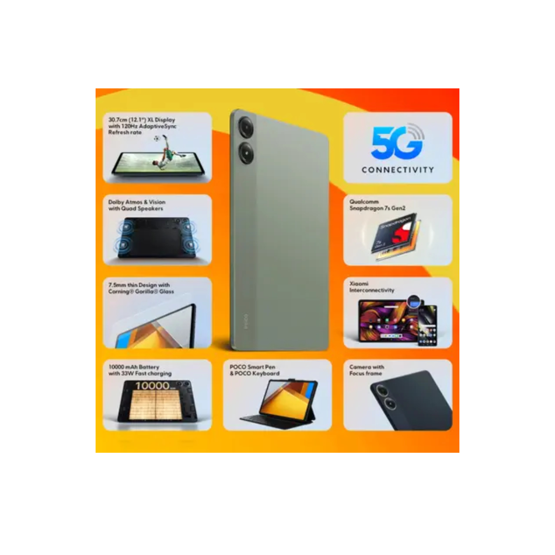 The Poco Pad 5G Tablet is a versatile single SIM device supporting 3G,4G,5G,and Wi-Fi connectivity, powered by the Snapdragon 7s Gen2 octa-core 2.4GHz processor with 8GB RAM and 128GB internal storage.It features a large 12.1-inch display with 1600×2560 resolution and a smooth 120Hz refresh rate for immersive viewing.The massive 10000mAh battery with 33W fast charging ensures long-lasting usage and quick recharging.Capture everyday moments and video calls with the 8MP rear camera and 8MP front camera.The tablet also supports memory card expansion up to 1.5TB, making it ideal for entertainment, productivity, and storage needs.