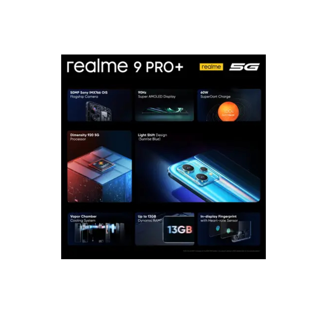 The Realme 9 Pro Plus 5G is a stylish dual SIM smartphone offering fast connectivity with 3G, 4G, 5G, VoLTE, and Wi-Fi support. It is powered by the MediaTek Dimensity 920 5G octa-core processor clocked at 2.5 GHz, paired with 8 GB RAM and 256 GB internal storage for smooth performance. The phone features a vibrant 6.4-inch punch-hole display with Full HD+ resolution and a 90 Hz refresh rate. Capture sharp and detailed photos with the 50 MP + 8 MP + 2 MP triple rear camera and a 16 MP front camera. Running on Android 12, it is backed by a 4500 mAh battery with 60W fast charging for quick and efficient power.