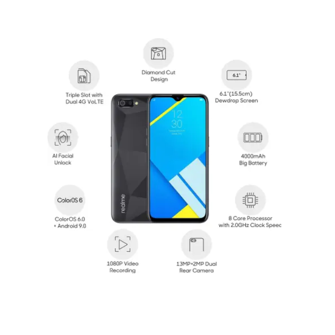 The Realme C2 is an affordable dual SIM smartphone offering essential connectivity with 3G, 4G, VoLTE, and Wi-Fi support. It is powered by the MediaTek Helio P22 octa-core processor clocked at 2 GHz, paired with 2 GB RAM and 32 GB internal storage, expandable up to 256 GB via a memory card. The device features a large 6.1-inch display with HD+ resolution and a water drop notch design. Capture everyday moments with a 13 MP + 2 MP dual rear camera and a 5 MP front camera. Running on Android 9 Pie, it is backed by a 4000 mAh battery for dependable daily usage.