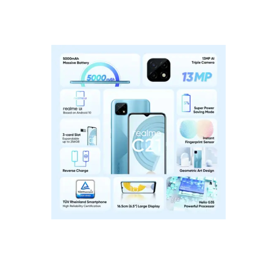 The Realme C21 is a dual SIM smartphone supporting 3G and 4G connectivity with VoLTE and Wi-Fi. It is powered by the Helio G35 octa-core processor, paired with 4 GB RAM and 64 GB internal storage, expandable up to 256 GB. The phone features a large 6.5-inch HD+ display with a water drop notch for immersive viewing. It comes with a 13 MP triple rear camera setup and a 5 MP front camera for daily photography. Running on Android 10, it is equipped with a 5000 mAh battery for long-lasting usage.