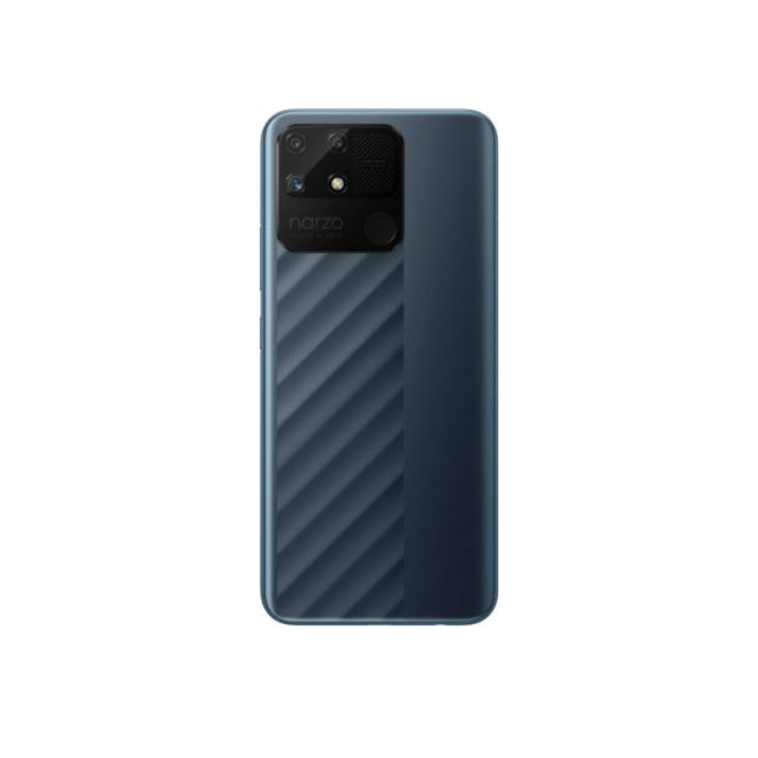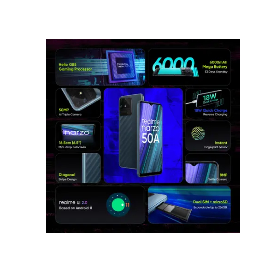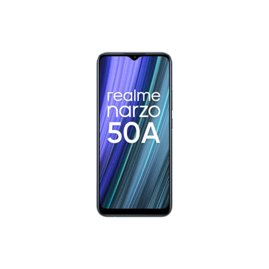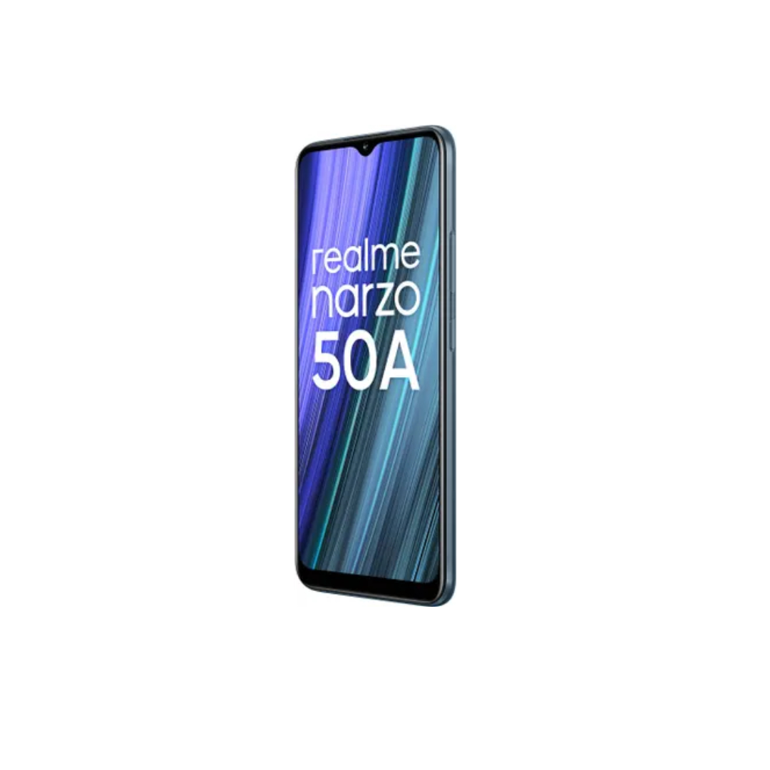 The Realme Narzo 50A is a reliable dual SIM smartphone with support for 3G, 4G, VoLTE, and Wi-Fi connectivity. It is powered by the Helio G85 octa-core processor clocked at 2 GHz, paired with 4 GB RAM and 128 GB internal storage expandable up to 256 GB. The phone features a large 6.5-inch HD+ display with a water drop notch for immersive viewing. It comes with a 50 MP triple rear camera setup and an 8 MP front camera for everyday photography. Running on Android 11, it houses a massive 6000 mAh battery with 18W fast charging for long-lasting performance.