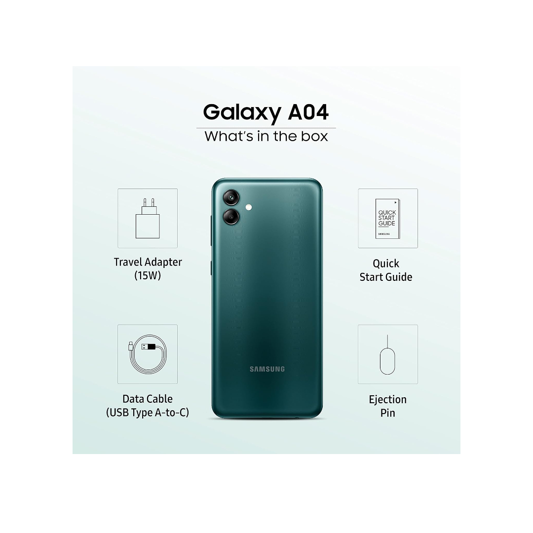 The Samsung Galaxy A04 is a budget-friendly dual SIM smartphone offering reliable connectivity with 3G, 4G, VoLTE, and Wi-Fi support. It is powered by the MediaTek Helio P35 octa-core processor clocked at 2.3 GHz, paired with 4 GB RAM and 64 GB internal storage, expandable up to 1 TB via a memory card. The phone features a large 6.5-inch HD+ display with a water drop notch design. Capture clear photos with a 50 MP + 2 MP dual rear camera and a 5 MP front camera. Running on Android 12, it is backed by a 5000 mAh battery with fast charging for dependable daily performance.