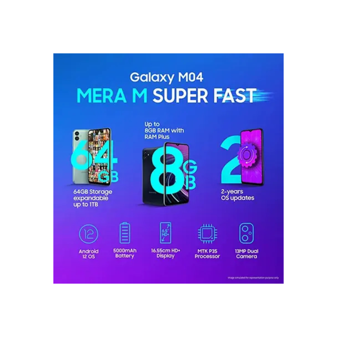The Samsung Galaxy M04 is a dual SIM smartphone with 3G and 4G VoLTE support, offering smooth connectivity and reliable performance. It runs on a Helio P35 octa-core processor paired with 4 GB RAM and 64 GB internal storage, expandable up to 1 TB via memory card. The phone features a 6.5-inch HD+ display with a water drop notch for comfortable viewing. It comes with a 13 MP plus 2 MP dual rear camera and a 5 MP front camera for everyday photography needs. Powered by Android 12, the device is backed by a 5000 mAh battery with 15W fast charging for long-lasting use.