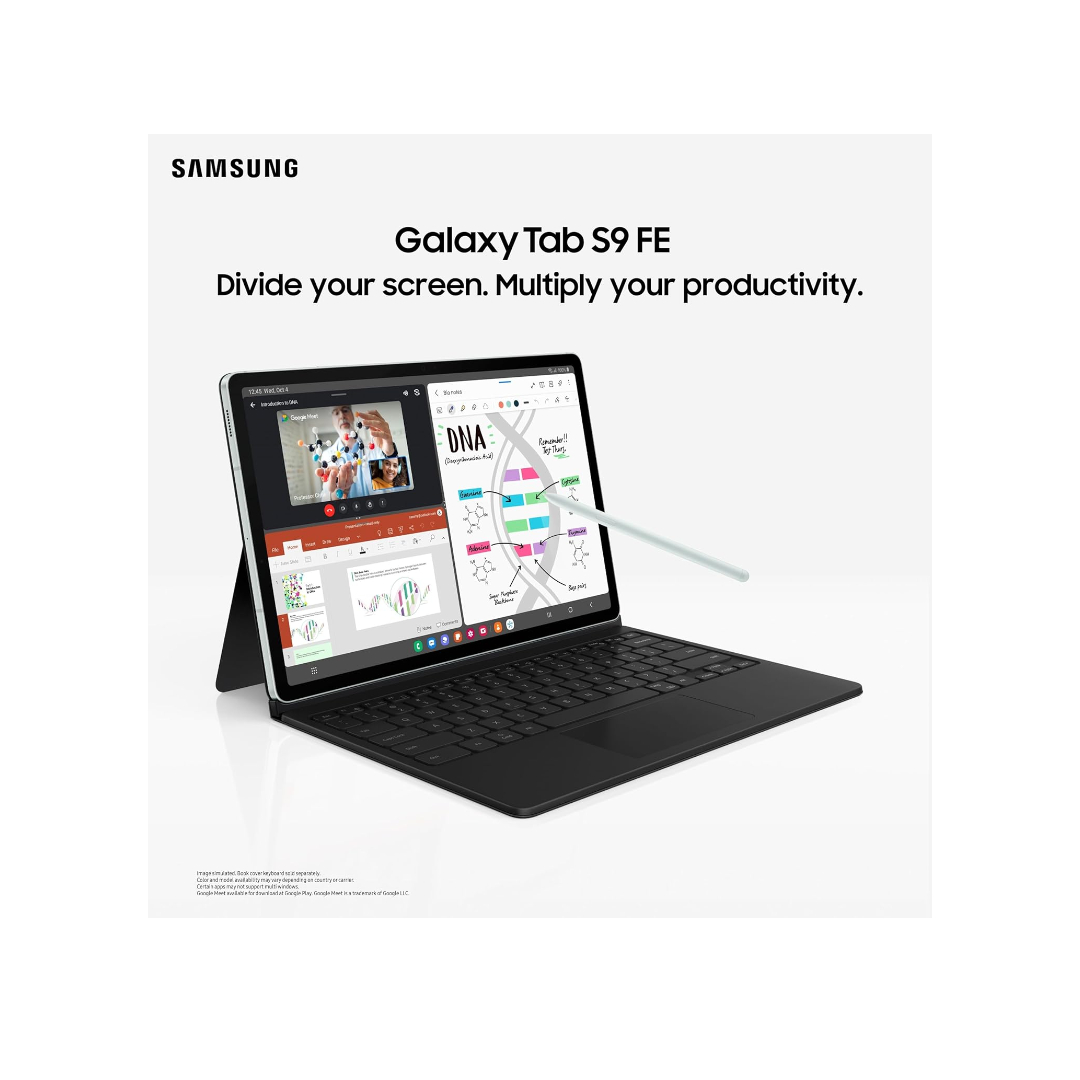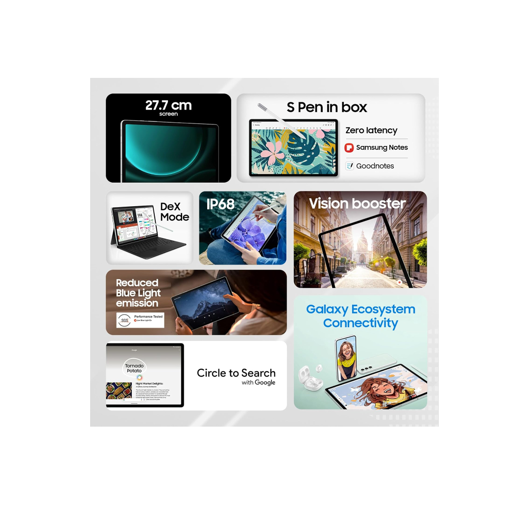 The Samsung Galaxy Tab S9 FE delivers smooth performance with its Exynos 1380 octa-core 2.4 GHz processor, 6 GB RAM and 128 GB storage for fast multitasking. Its large 10.9-inch 90 Hz display with 1440 × 2304 resolution offers sharp and fluid visuals for videos, gaming and browsing. The 8 MP rear and 12 MP front cameras capture clear photos and handle video calls with ease. An 8000 mAh battery with 45 W fast charging keeps you powered throughout the day with quick top-ups. With Single SIM 5G, VoLTE, Wi-Fi and support for up to 1 TB expandable storage, it delivers a balanced and versatile tablet experience.
