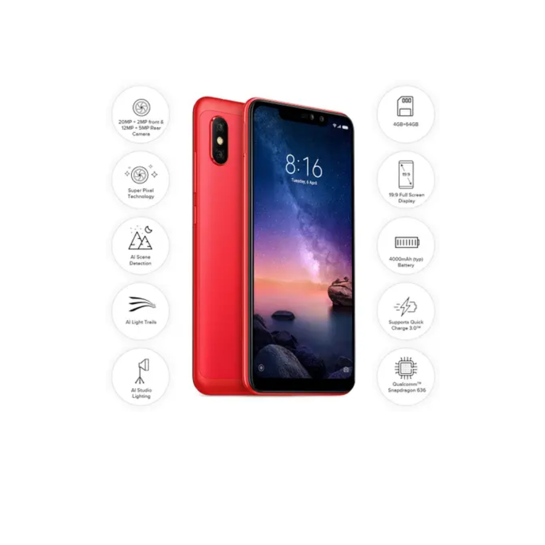 The Xiaomi Redmi Note 6 Pro is a dual SIM smartphone with 3G and 4G VoLTE support, along with Wi-Fi and an IR blaster for added convenience. It is powered by a Snapdragon 636 octa-core processor paired with 6 GB RAM and 64 GB internal storage expandable up to 256 GB. The phone features a 6.26-inch Full HD+ display with a large notch for an immersive viewing experience. For photography, it offers a 12 MP plus 5 MP dual rear camera and a 20 MP plus 2 MP dual front camera setup. Running on Android 8.1 Oreo, it is backed by a 4000 mAh battery with fast charging support for reliable daily use.