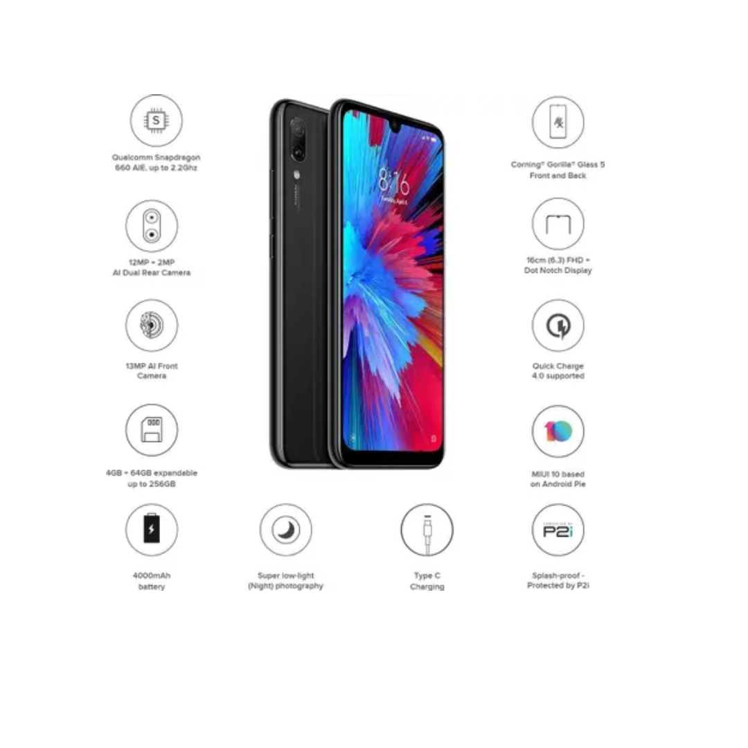 The Xiaomi Redmi Note 7 is a versatile dual SIM smartphone offering 3G and 4G connectivity with VoLTE, Wi-Fi, and an IR blaster for added convenience. It is powered by a Snapdragon 660 octa-core processor paired with 4 GB RAM and 64 GB internal storage, expandable up to 256 GB via hybrid memory card support. The phone features a 6.3-inch Full HD+ display with a water drop notch, delivering clear visuals and an immersive viewing experience. For photography, it comes with a 12 MP + 2 MP dual rear camera setup and a 13 MP front camera for sharp photos and selfies. Running on Android 9.0 Pie, the device is backed by a 4000 mAh battery with fast charging for dependable daily performance.