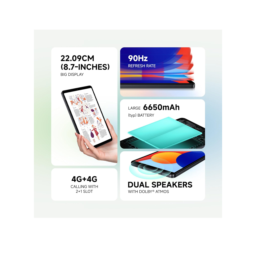 The Xiaomi Redmi Pad SE 8.7 4G is a compact dual SIM tablet supporting 3G,4G,Wi-Fi,and an IR blaster, powered by the Helio G85 octa-core 2GHz processor with 4GB RAM and 128GB internal storage.It features an 8.7-inch display with 800×1340 resolution and a smooth 90Hz refresh rate for everyday viewing.The 6650mAh battery with 10W fast charging delivers reliable all-day usage.Capture moments with the 8MP rear camera and enjoy video calls using the 5MP front camera.The tablet also supports memory card expansion up to 1TB, making it suitable for entertainment, browsing, and daily tasks.